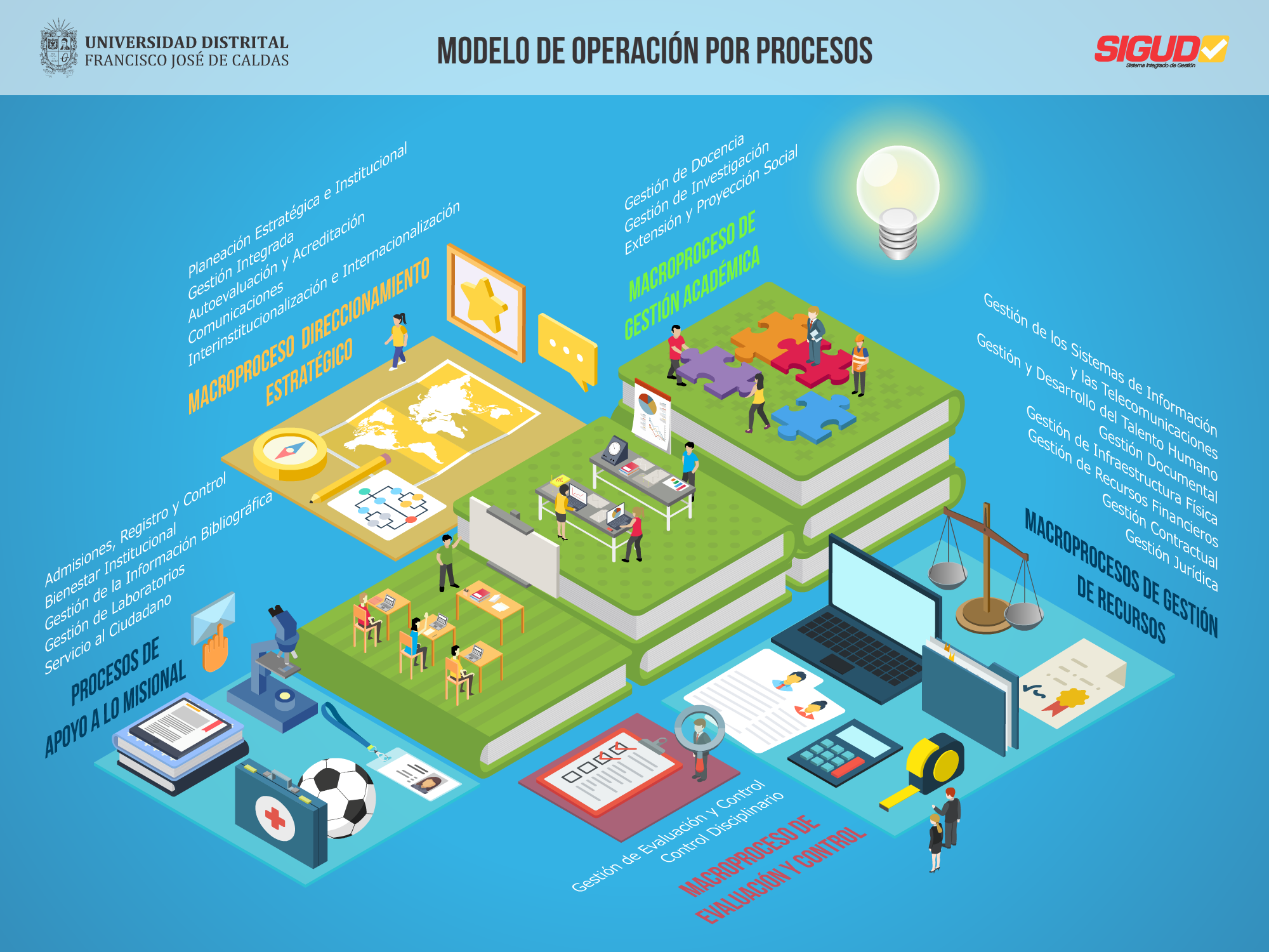 El Modelo de Operación por Procesos de la Universidad Distrital Francisco José de Caldas se representa a través de una cadena de valor, conformada por cuatro (4) tipos de Macroprocesos y 22 Procesos, en la cual se identifica la interrelación de sus elementos y la generación de valor para garantizar la sostenibilidad de la institución y el cumplimiento de la misión.